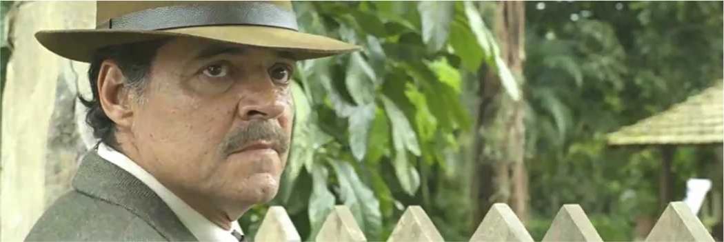 O capanga tem um ataque ao ver Eurico saindo do quarto da empresária e a ameaça. Confira em 'O Sétimo Guardião'