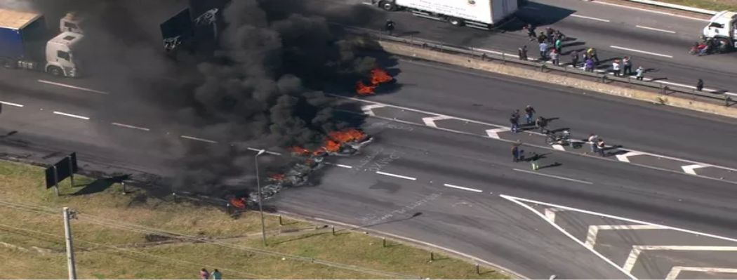 Manifestantes incendiaram pneus em Embu das Artes. Há congestionamento nos dois sentidos da rodovia.