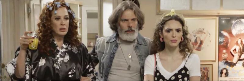 Lidiane (Claudia Raia) e Jofre conversam diante da televisão na casa da Pantera e Manuzita chega e se depara com o que está passando na PopTV: