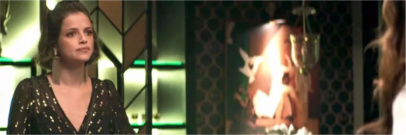 Sabendo que Ellen (Rosane Gofman) a encontrou no leilão e sabe de toda farsa, Jô fuzila a funcionária da mãe com o olhar.